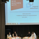 Auf Schulebene wurde daher hart aber fair, geistreich und emotional, in jedem Fall: angeregt und anregend diskutiert. Die Pro- und Contra-Gruppen traten in Podiumsdiskussionen in mehreren Runden in gemischten Teams gegeneinander an und diskutierten vor Jury, Zeitwächtern und Publikum aktuelle und brisante Streitfragen, wie „Soll an Kinder und Jugendliche gerichtete Werbung für ungesunde Lebensmittel verboten werden?“, „Soll Mobbing an Schulen härter bestraft werden?“ oder „Sollen Schönheitswettbewerbe und Modelcastingshows in Deutschland verboten werden?“